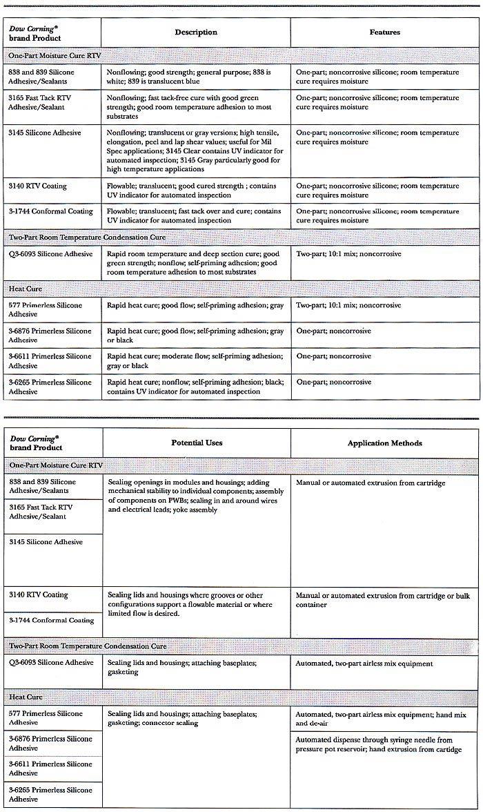 Dow Corning offers a variety of noncorrosive silicone products for electronic sealing, bonding and adhering applications. These adhesives generally fall into three cure types. The first group are moisture cure, generally meant for room-temperature processing. The second type (condensation cure) offers rapid room-temperature and deep-section curing. The third type is heat cure for rapid processing. All convert to durable, relatively low stress elastomers. Most will develop good, primerless adhesion to a variety of common substrates including ceramics, reactive metals and filled plastics.