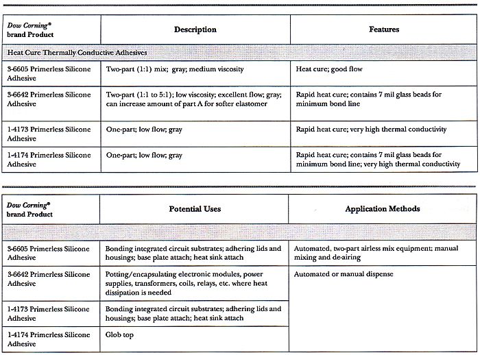 Dow Corning offers a variety of noncorrosive, thermally conductive silicone adhesives that are ideally suited for use in bonding hybrid integrated circuit substrates, components and devices to heat sinks, as well as for use in other bonding applications where flexibility and thermal conductivity are major concerns. The flowable products are also ideal for use as thermally conductive potting materials for transformers, power supplies, coils, relays and other electronic devices that require improved thermal dissipation.