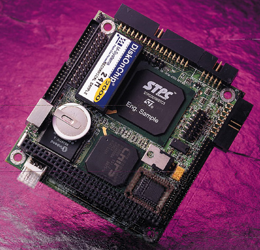 Utilizing the Chips and Technologies 69000 Flat panel controllers allows AAEON to provide connections to the most popular new high resolution TFT and STN color flat panels, including 36-bit TFT LCD displays. The onboard 32-pin DIP socket is reserved for the M-Systems DiskOnChip 2000 series: a solid state disk with capacities ranging from 2MB to 144MB. The DiskOnChip is an attractive alternative to the traditional hard disk because of its superior reliability.