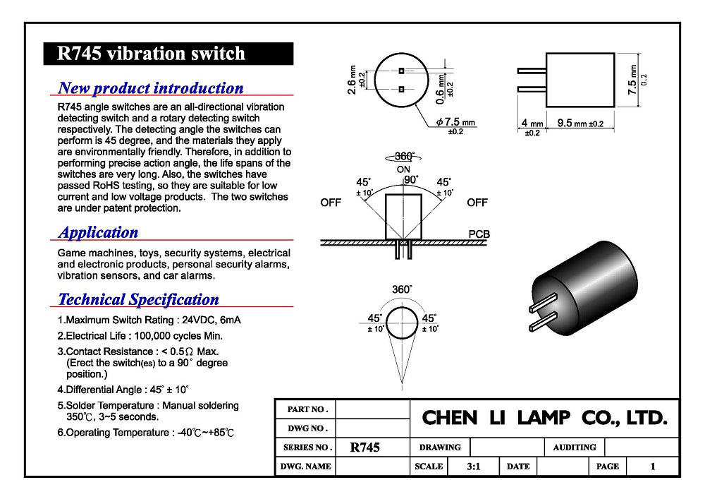 R745 angle switches are an all-directional vibration detecting switch respectively. The detecting angle the switches can perform is 45 degree, and the materials the apply are environmentally friendly. Thefore, in addition to performing precise action angle, the lif spans of the switches are very long. Also, the switches have passed RoHS testing, so they are suitable for low current and low voltage products. The two switches are under patent protection.