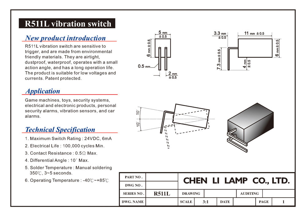 The R511L vibration switches are sensitive to trigger, and are made from environmental friendly materials. They are airtight, dustproof, waterproof, operates with a small action angle, and has a long operation life. The product is suitable for low voltages and currents. Patent protected.