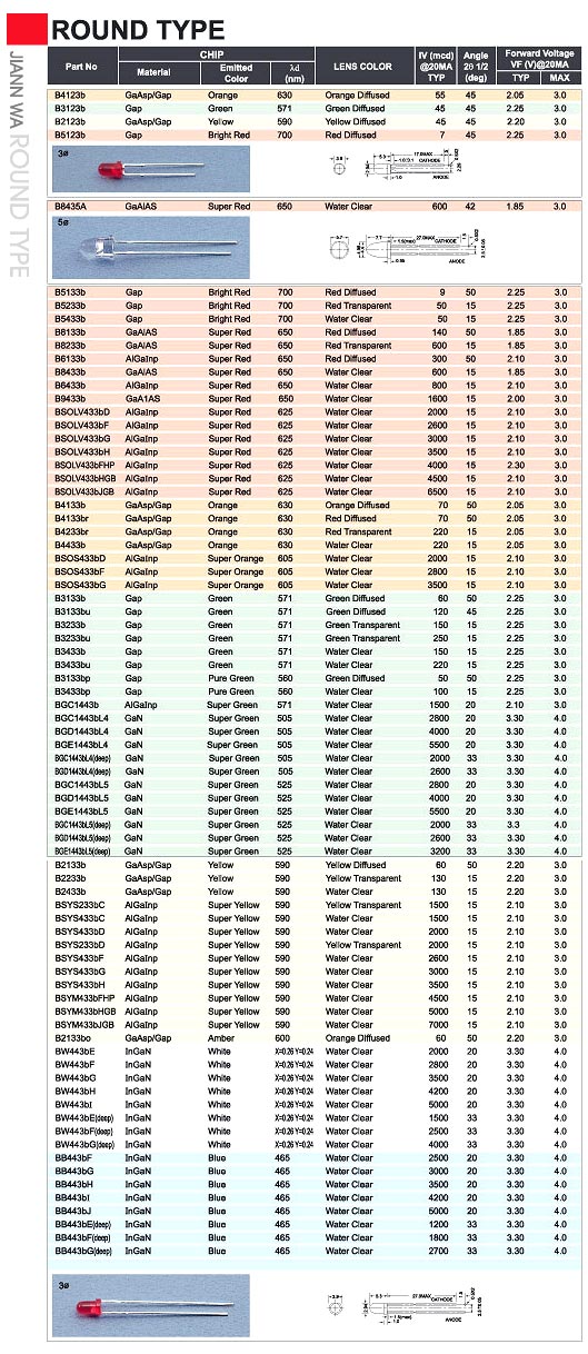 | BB443bF (deep) | InGaN | Blue | 465 | Water Clear | 1,800 | 33 | 3.30 | 4.0 |