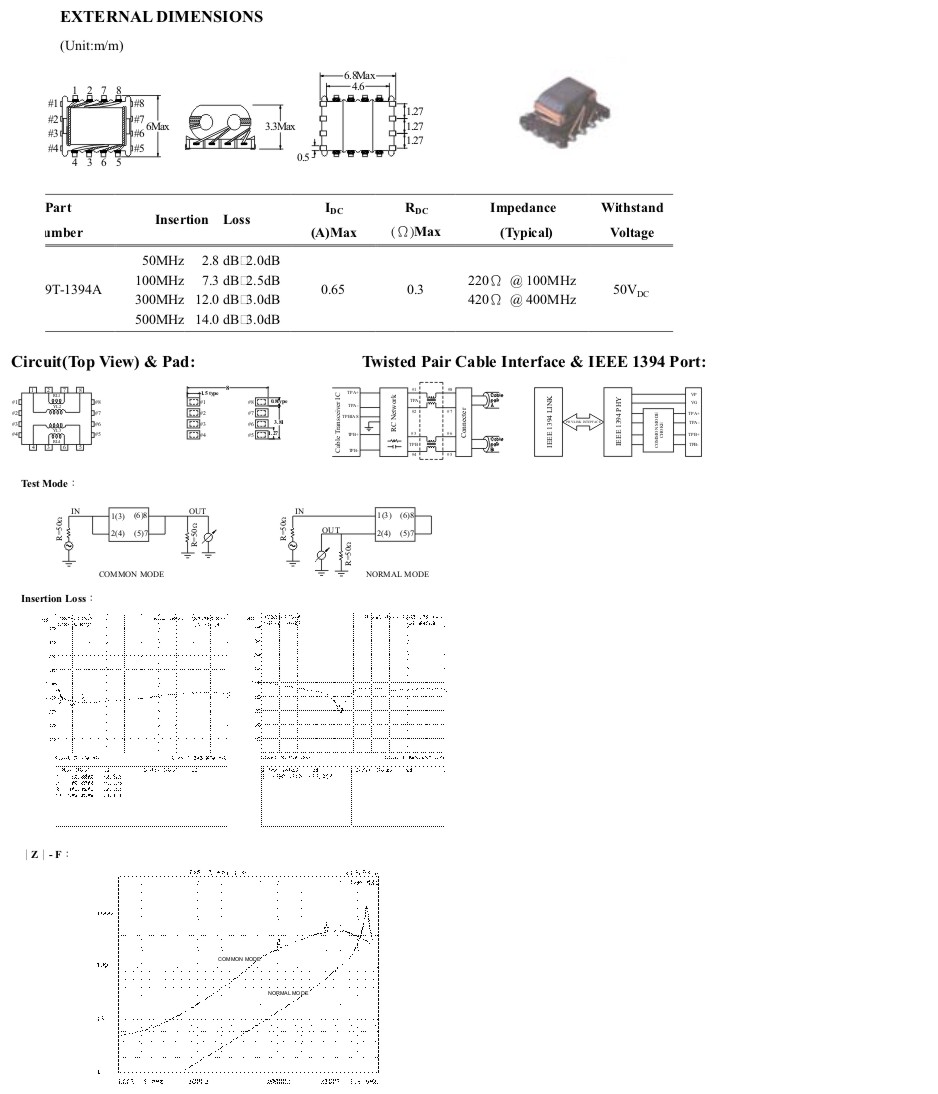 2.Common mode impedance of 220Ω at 100MHz ,420Ω at 400MHz.