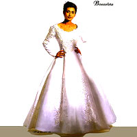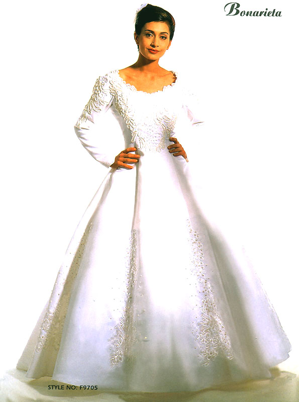 Princess-line dress in satin with as off-the-shoulder short-sleeved bodice, decorated with embroidery.