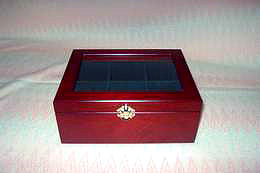 L x W x H = 228 x 178 x 90 mm, wooden display box with removable compartment, cherry finish, glass panel, velvet interior. wall thickness of box: 90 mm, each compartment: 68 x 78 mm. Colors are on option. Can be etched or imprinted graphics on glass panel or imprinted on wooden surface. No extra charge for custom made. Custom design items are welcomed.
