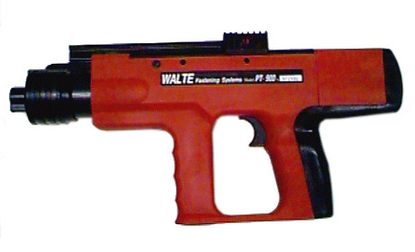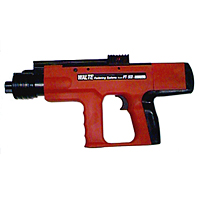 Universal semi-automatic powder actuated tool for medium and heavy duty pin and stud fastening with power grading and silencer.