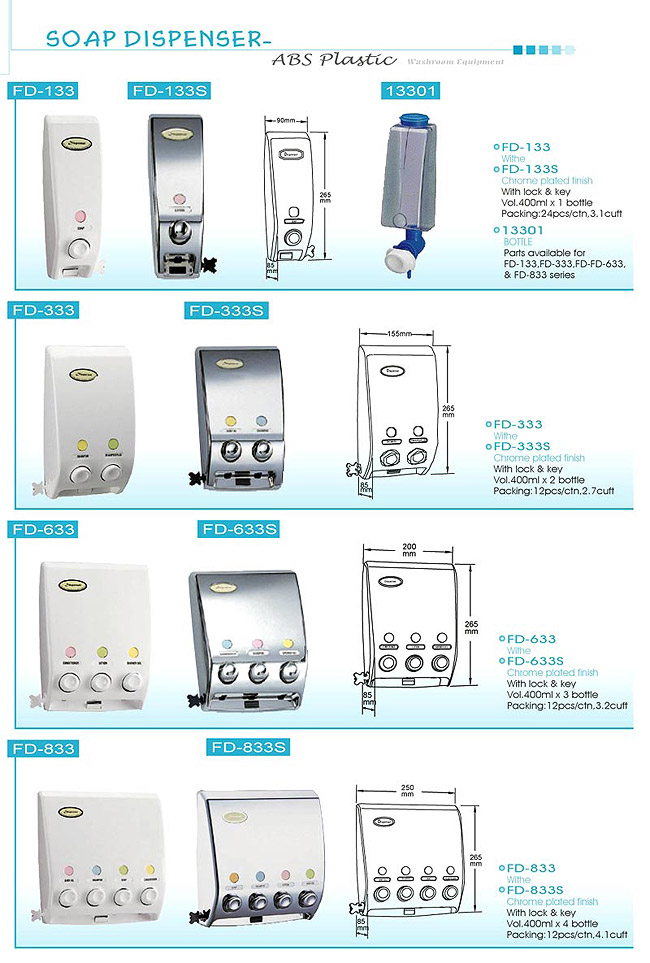 - Soap dispenser with inner container: FD-133, FD-133S, FD-333, FD-333S, FD-633, FD-633S, FD-833, FD-833S.
