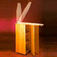 No more tedious lugging a heavy board out of the closet. Three storage compartments for iron starch and other supplies as well as a built in ironing board with cover and pad.