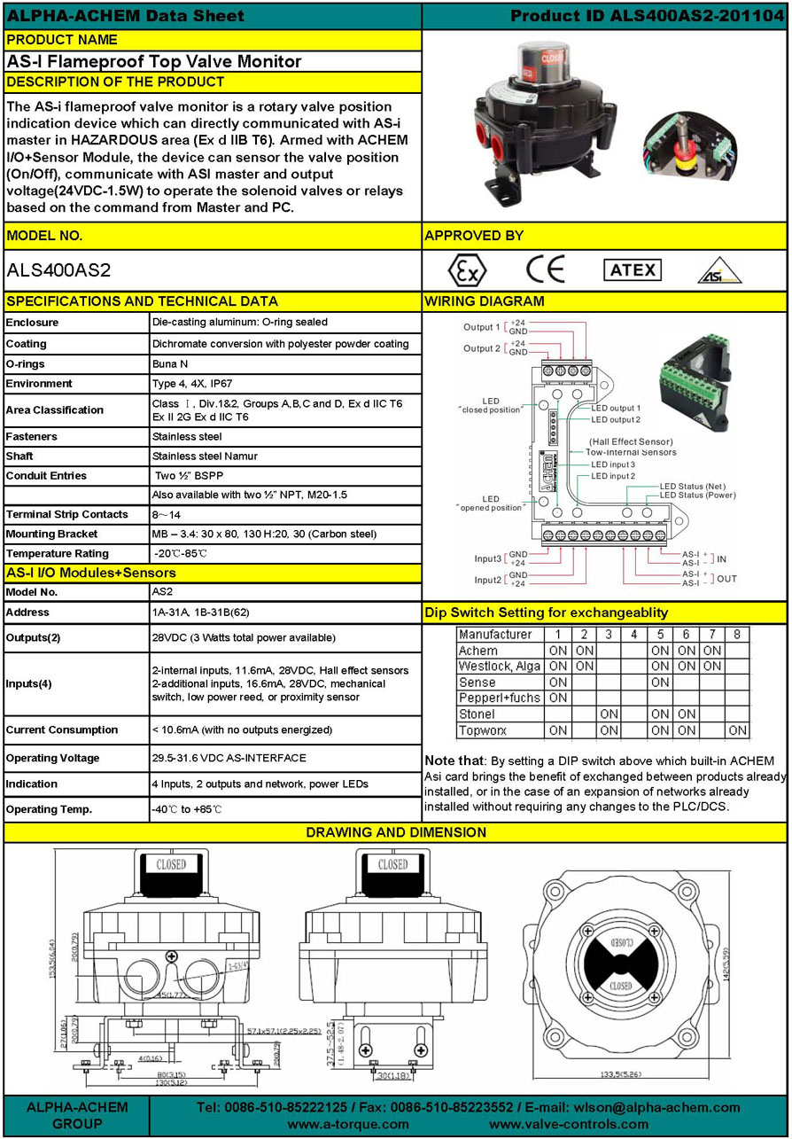 ALS series explosion proof ASi box including ALS400, ALS500 and ALS600 series were designed and manufactured by AFL Group through advance state-of-the-art engineering technology and its special patent technology which have the explosion proof ASi box to be solid, beautiful and with high-level quality. All of the ALS series explosion proof ASi box fully meet ISO5211, Namur and IP67 standards. The mechanical switch, proximity sensor, magnet sensor, ASi sensor and DeviceNet sensor are all available in ALS series explosion proof ASi box.