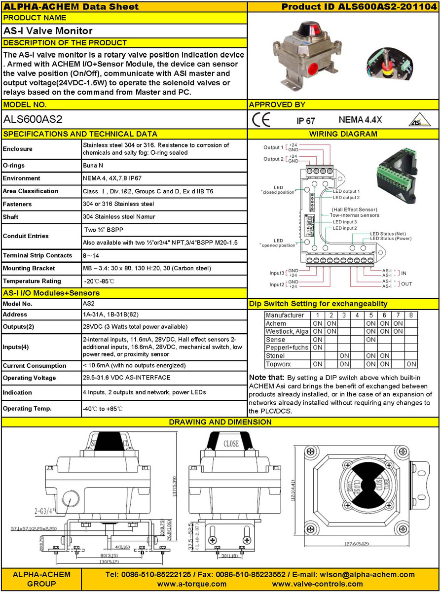 ALS series stainless steel ASi monitor including ALS400, ALS500 and ALS600 series were designed and manufactured by AFL Group through advance state-of-the-art engineering technology and its special patent technology which have the stainless steel ASi monitor to be solid, beautiful and with high-level quality. All of the ALS series stainless steel ASi monitor fully meet ISO5211, Namur and IP67 standards. The mechanical switch, proximity sensor, magnet sensor, ASi sensor and DeviceNet sensor are all available in ALS series stainless steel ASi monitor.