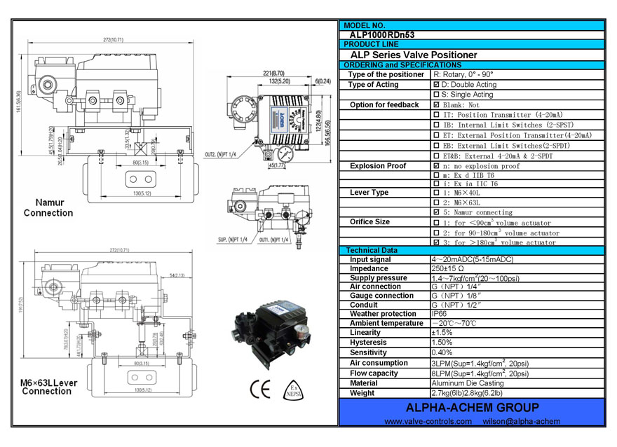 | PRODUCT LINE | ALP Series Pneumatic Positioner | Input signal | 4~20mADC(5-15mADC) |