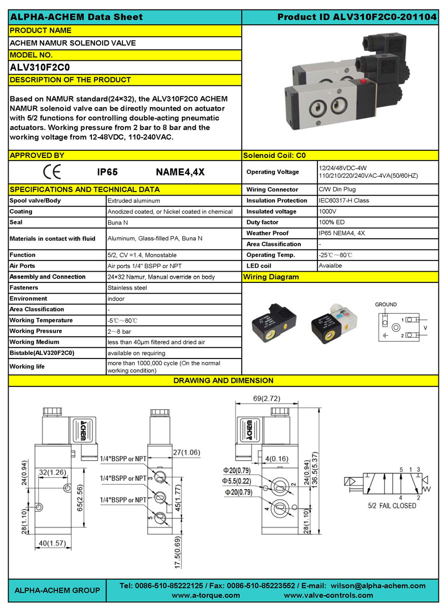 ACHEM ALV series 5/2 solenoid valve, pipe and/or plate connection version, is a five-way/three-way, two-position solenoid operated and spring return valve. The integral slot throttle structure design and high precision finishing technique for valve and spool allow for positive shifting of air flow with larger CV value than the one of competitor and constant cleaning of the spool with each shift, enabling the valve to stroke millions of trouble-free cycles. The ACHEM ALV series 5/2 solenoid valve is intended for use on all Valves & Controls rack and pinion actuators that incorporate the standard of Namur accessory directional control valve mounting pad (24mm x 32mm rectangle or 40mm x 45mm rectangle).