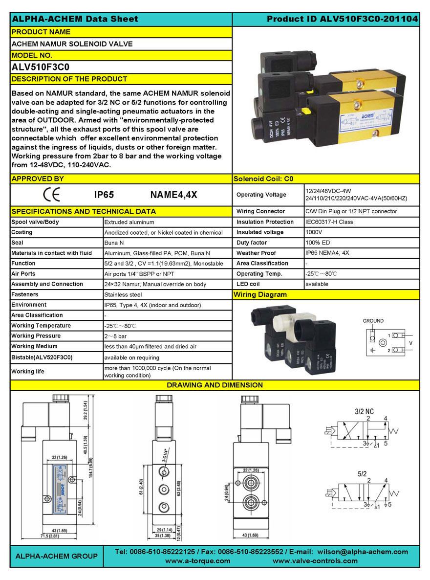 All the exhaust ports of this solenoid valve are connectable, providing better environmental protection. In the family of ALV series, the stainless steel, aluminum spool valve and the explosion proof coils can be used for the application in any hazardous location and anywhere in the World.