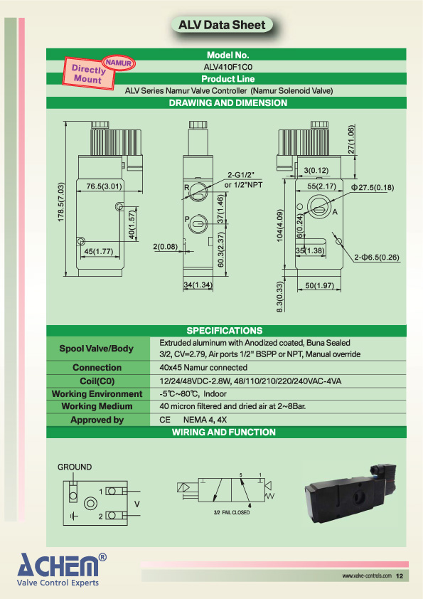 ACHEM ALV series electric solenoid valve, pipe and/or plate connection version, is a five-way/three-way, two-position solenoid operated and spring return valve. The integral slot throttle structure design and high precision finishing technique for the solenoid valve and spool allow this product for positive shifting of air flow. Also, with larger CV value of air flow than other competitors, and constant cleaning of the spool with each shift, these advantages enable the valve to stroke millions of trouble-free cycles.