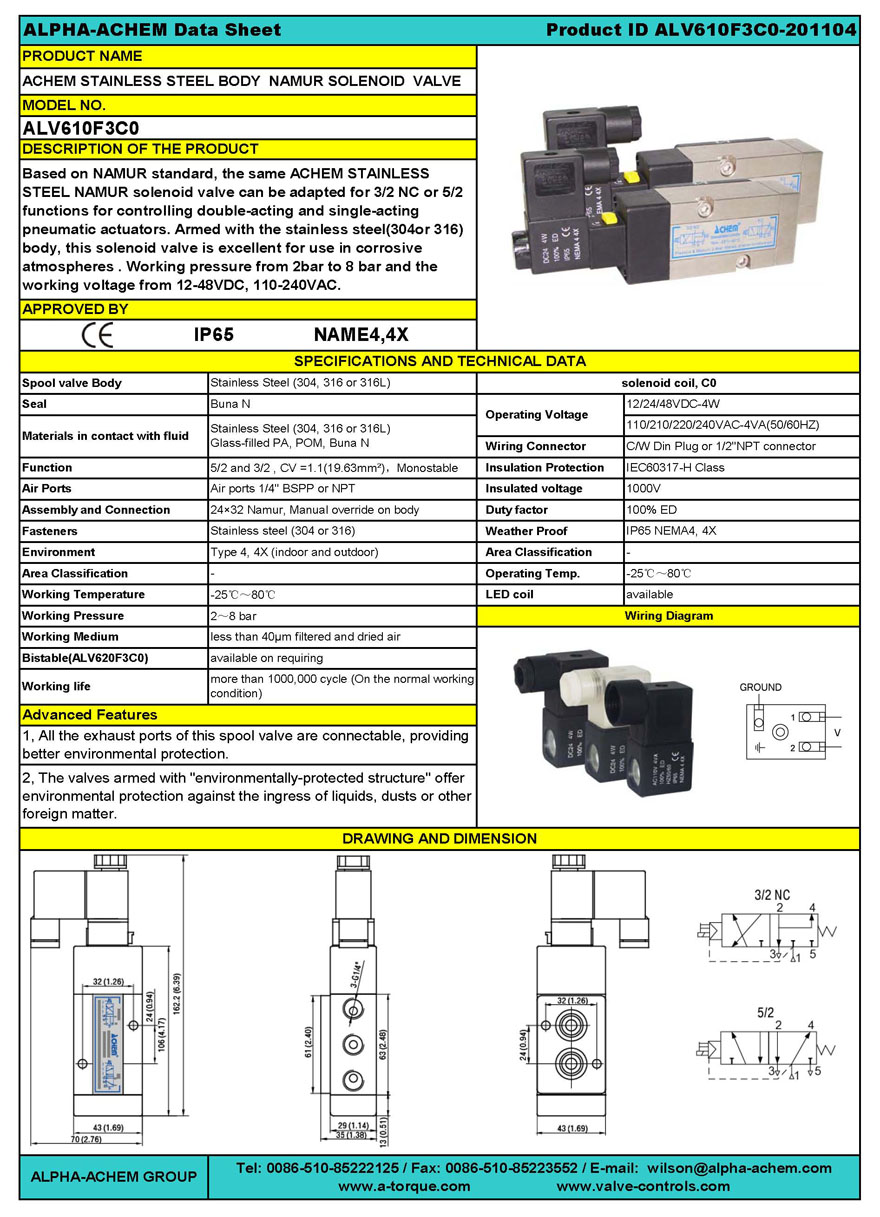 ACHEM ALV series NAMUR stainless steel and brass solenoid valve is designed and manufactured by us based on advanced air control technology and our special patent technology. The product armed with "environmentally-protected structure" offers environmental protection against the ingress of liquids, dusts or other foreign matter and provides a constant self cleaning action within every position shift enabling the solenoid valve to achieve over a million trouble-free cycles.