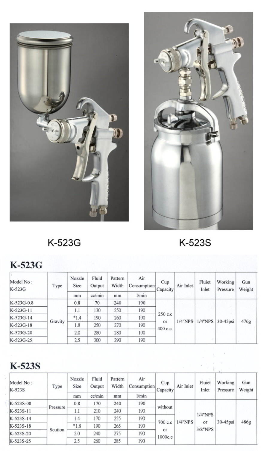 Description : • Conventional Gravity- Feed Spray Gun, suitable for automotive refinishing painting and industrial applications • Nozzle Set is 100% strictly hand- checked to ensure the finest atomization , Fluid Nozzle and Needle are made of stainless steel with hardened treatment , Air Cap is made of brass for ensuring a long lifetime. • Water-borne paint materials qualified • Conventional Bottom-Feed Spray Gun, suitable for painting jobs on construction or industrial applications • Nozzle Set is 100% strictly hand- checked to ensure the finest atomization , Fluid Nozzle and Needle are made of stainless steel, Air Cap is made of brass for ensuring a long lifetime.Main Products