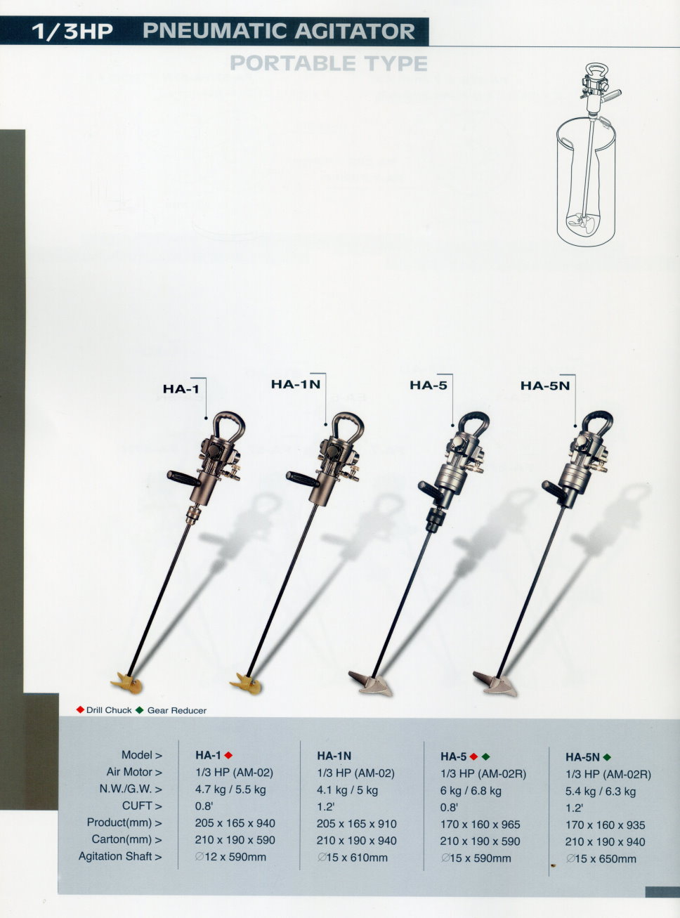The professional agitator developed by our R&D team is high quality and durable. It has been marketed around the world. This product was designed to meet the market�䏭 needs with a variety of models. It can effectively raise your work efficiency ! And the air motor is durable and stable. The professional high-quality air agitator was made in Taiwan. It is absolutely your best choice !!