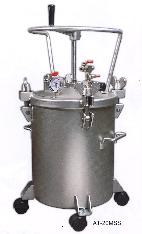1. Pot body is one-piece formed of high-quality Stainless Steel. 2. Capacity 20 litre 3. Max. working pressure : 4.1 Bar / 60 PSI 4. Top fluid outlet 5. Pressure tanks is equipped with manual agitator. 6. Agitator blade is made of stainless steel. Applied for : 1. Waterborne fluids like paints, adhesives, etc. 2. Glue 3. High-viscosity fluids. 4. Acid fluids, alkaline fluids and other chemical fluids. 5. General paints adding with solvent.