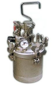 1. Pot body is one-piece formed of high-quality Stainless Steel. 2. Capacity 2 litre 3. Max. working pressure : 4.1 Bar / 60 PSI 4. Top fluid outlet 5. Pressure tanks is equipped with air agitator 6. Agitator blade is made of stainless steel. Applied for : 1. Waterborne fluids like paints, adhesives, etc. 2. Glue 3. High-viscosity fluids. 4. Acid fluids, alkaline fluids and other chemical fluids. 5. General paints adding with solvent.