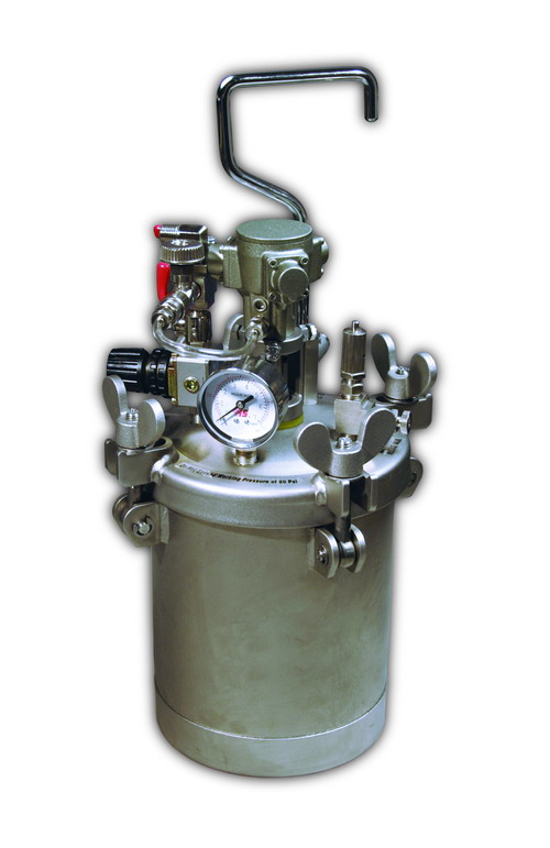 1. Pot body is one-piece formed of high-quality Stainless Steel. 2. Capacity 4 litre 3. Max. working pressure : 4.1 Bar / 60 PSI 4. Top fluid outlet 5. Pressure tanks is equipped with air agitator 6. Agitator blade is made of stainless steel. Applied for : 1. Waterborne fluids like paints, adhesives, etc. 2. Glue 3. High-viscosity fluids. 4. Acid fluids, alkaline fluids and other chemical fluids. 5. General paints adding with solvent.