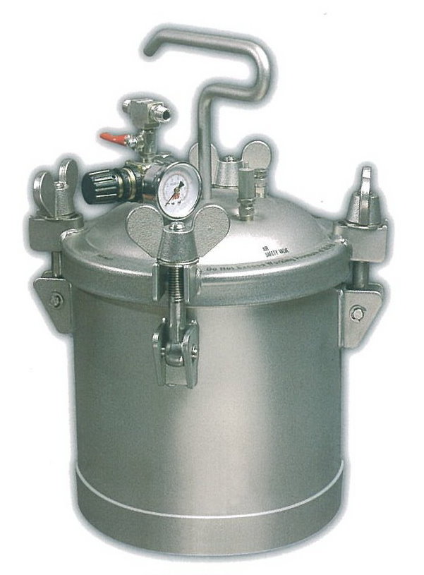 Features : 1. Pot body is one-piece formed of high-quality Stainless Steel. 2. Capacity 10 litre 3. Max. working pressure : 4.1 Bar / 60 PSI 4. Top fluid outlet Applied for : 1. Waterborne fluids like paints, adhesives, etc. 2. Glue 3. High-viscosity fluids. 4. Acid fluids, alkaline fluids and other chemical fluids. 5. General paints adding with solvent.