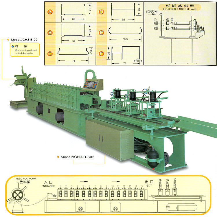This separable forming machine is suitable for products in one shape but with different sizes. One side of the machine is fixed and other side can be separated. It is easy to disassemble and assemble and will save machining cost for products in small quantity but in various shapes, suitable for room division, column and upper-and lower trough. It's really a forming machine of cost-saving and manpower-saving.