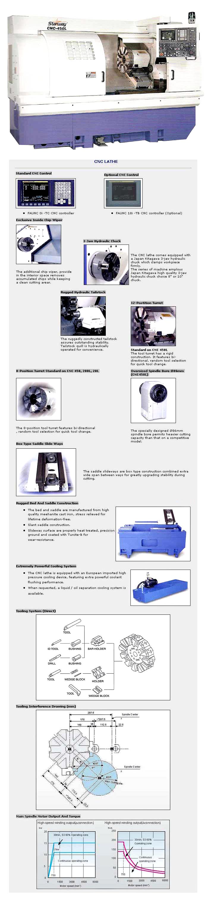 CNC-450L, turning diameter is 330mm, turning length is 820mm, machine dimensions (L x W x H) is 3,400 x 2,300 x 1,900mm, the machine weight is 5,400kgs.