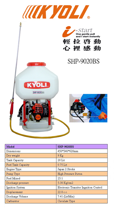 Power Sprayer for backpack type with 20 litre chemical tank and super backpack tarter (One gentle pull and I start instantly). And use 22.8cc two-stroke engine.