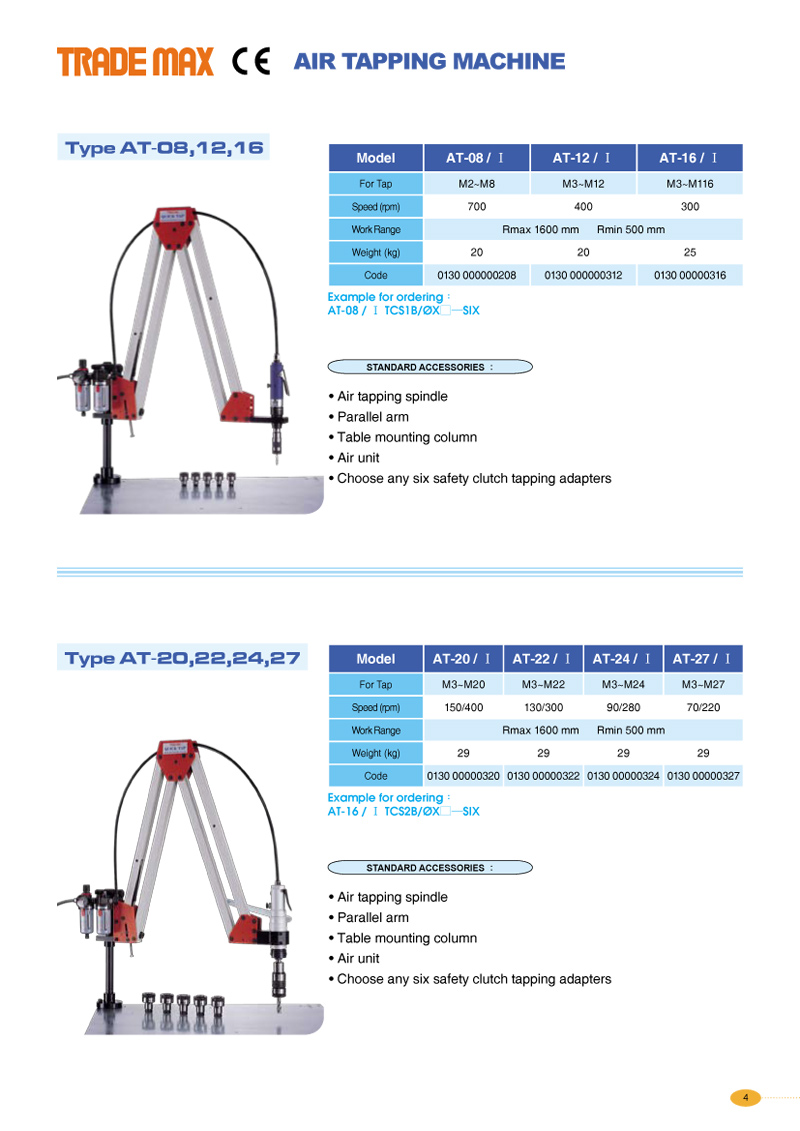 The AT/I series pneumatic tapping machine was suitable for use on the working rang of 500mm ~ 1600mm, quick change safe clutch tap holder M2 ~ M27 to adapt your tapping work convenient and efficiently.