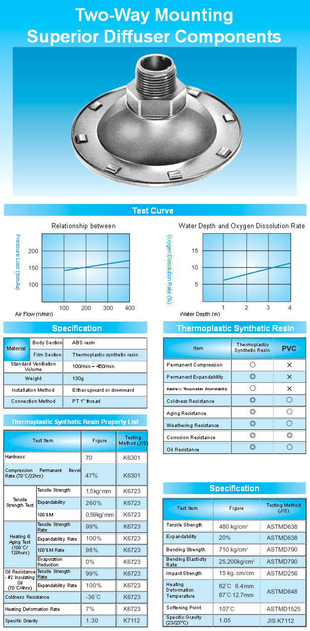 The body is made of high-class ABS compound, which exhibits superb temperature resistance and softening temperature point that cannot be comparable by ordinary ABS plastic material. The valve body is made of high-class synthetic resin, which exhibits weathering, oil and corrosion resistance as well as lower aging and deforming features. The lifespan is about 3 times over the ordinary rubber or PVC products.