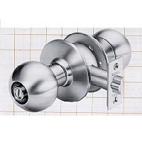 Latch bolt operated by knobs from either side except when outside knob is locked by universal button in inside knob. Turning key outside or knob inside automatically releases locking button. Universal button has slot in head and can fixed in locked position by turning it with coin or screw driver. Latch bolt is automatically deadlocked when door is closed.