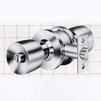 Latch bolt operated by knobs from either side except when outside knob is locked by universal button in inside knob. Turning key outside or knob inside automatically releases locking button. Universal button has slot in head and can be fixed in locked position by turning it with coin or screw driver. Latch bolt is automatically deadlocked when door is closed.