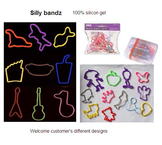 Silly bandz was made of 100% silicon gel and have many different shapes,assorted colors.It is high elastic,children can squeeze it,stretch,but not easy to be broken,and would return to original shape after your stretch it.