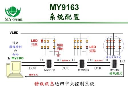 The MY9163 provides compulsory error detection. Under compulsory error detection, the display image will not be affected since the interval and current are small. Differing from error mode selections; the specified diagnostic can be performed. The error will be stored back to the shift register and could be read out from the DO pin. Moreover, the threshold voltage for LED short detection can be selected to comply with different LED string configuration.