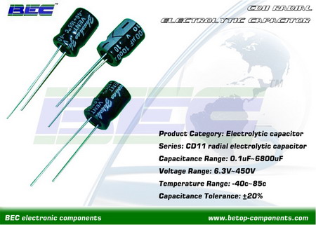 CD11 aluminum electrolytic capacitor is a super miniature size capacitor for general use. The temperature range covers from -40℃ to 85℃ and voltage range covers from 6.3V up to 450V. It’s widely used in general electronic equipments like TV-sets, radio, video and audio products, computer, telephone and stereo. It is widely used in home electric appliances like TV-sets, radio, video and audio products, computer, telephone and stereo.