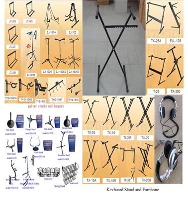 all kinds of stands we have for keyboad,guitar,cymbal,drumhead display.drumstick display,practice drum,trumpet stand,flutr stand,saxophone stand,strings stand,e-piano stand,plane shaped keyboard stand,universal guitar stand, music book table and so on.