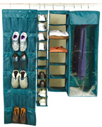 From left to right: 24 pocket shoe bag, 10 shelf shoe bag, shelf sweater/storage bag, hanging