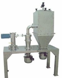 The turbine grader, as a forced centrifugal grader with secondary rotator is composed of grading rotator, guide vane rectifier, and screw feeder. The materials are fed through the upper cartridge, and the grains will be sieved and well distributed by the incoming air, which brings the grain to the grading zone. The centrifugal force produced by the fast rotation of grading rotator together it the centripetal force by the pneumatic adhesion act on the grading grains. When the centrifugal force on the grain is greater than the centripetal force, the coarser grains above the grading range will be swirled down along the container wall. The secondary air will be rectified to uniform cyclone through the guide vane, and separate the thinner grains from the coarser ones. The separated coarser grains will be blown out from the discharge port. The thinner gains below the collector, whereas the purified air will be vented outside from the draft. Features