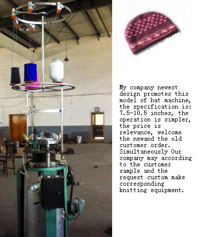 Our company newest design promotes this model of hat machine, the specification is: 7.5-10.5 inches, the operation is simpler, the price is relevance, welcome the newand the old customer order. Simultaneously Our company may according to the customer sample and the request custom make corresponding knitting equipment.