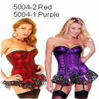 Boning all around danmask fabric with soft lace trimms.hook and eye closure at the back and strapless.garters can be removed comes with panty in the set.Colours avaiable are Sexy vibrant red as shown or Surreal Purple. Sizes S,m,LXL.Min order sold in 6packs order more and we offer you discounted pricing..