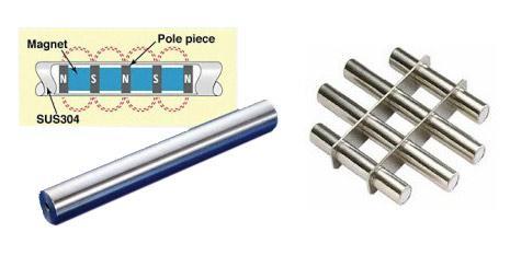 High-density permanent magnetic tubes are arranged to draw iron particles into the magnetic field and hold them there as material flows through the grate.