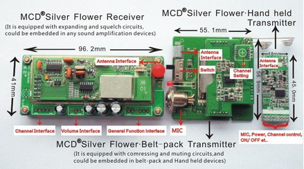 MCD Silver Flower is a pair of high-quality transceiver module of short distance, which integrates audio and compressing circuits. It covers a frequency range of VHF and UHF of 86~1000MHZ. The receiver consists of high-frequency receiving, audio demodulation, audio amplifying and squelch circuit, MCU frequency control and other functions. By simply adding an external antenna, an audio socket, a DIP switch for frequency setting, it can be embedded in a variety of devices such as audio amplifiers and lights. The transmitter consists of a high frequency transmitter, audio compressing and muting circuits. By simply adding an external MIC, an antenna and a shell, it can be made into portable audio transmitters, such as hand-held and belt-pack transmitters.