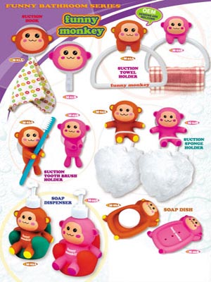 We supply funny monkey bathroom series,with towel hanger,towel horse,toothrush seat,bath ball,and so on items.Very novelty design with competitive price and good quality.