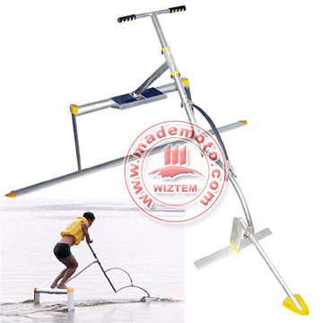 With your feet on the platform and your hands on the steering handles, simply hop up and down to propel yourself forward. The hydrofoils lift the Aquaskipper above the water, allowing you to move much faster than any other human-powered watercraft. Sine the Aquaskipper is light and strong made by aircraft aluminum and fiberglass.