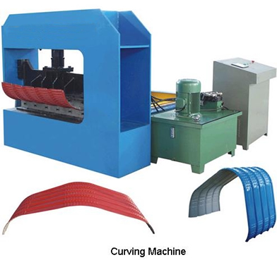 Curving Machine,bending machine,crimping machine. this bending machine is used to crimp the formed corrugated sheets into horizontal stripes through hydraulic crimping mold. The distance between each press will decide the curvature of the arch. It is suitable for edge of buildings ,parking garage, pavilion and various round roofs of buildings.