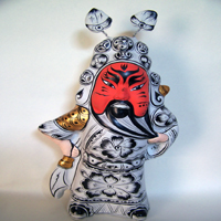 Guan Gong (The Revered Mr. Guan), a great general of Shuhan in the time of Three Kingdoms (220-280), is regarded by common people of our country as a symbol of "Mars", "Mammon" and "Aesculapius". The clay statue of Guan Gong, while keeping the traditional physical characteristics such as the red face, black bear, blue kerchief, green robe, and the dark dragon katana held in his hand, has been given more vitality, wit and nimbus by the ancient folk techniques, thus, looks like a great hero all the more, whose verve is displayed to a greater degree.
