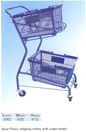 This stylish cart is designed to hold 2 large hand baskets(size:480*330*280mm) .Convenient for placing merchandise on checkout counter or for returning to store shelves. Four casters are 3"stem swivel caster.