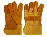 Golden cow split leather work gloves, patched palm, rubberized cuff, palm lined, yellow cotton back.