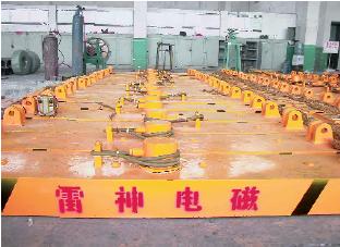 Lifting electromagnet is applied to lifting and transferring huge steel ingots, continuous casting plate blanks and heavy steel plates.