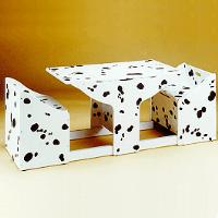 Our child's desk & chairs set is includes one desk and two chairs of children's dimension. The furniture is made of wood panels with diverse surface designs in kiddie colors and patterns. There are 3 ample-sized compartments, one in the desk and one each in the chairs to store his or her story books, toys, dolls and more. Desk top is foldable to open the desk compartment while remaining a quarter desk top in front of each of the two chairs or close the desk compartment to form a complete and flat top. Chairs can be placed under the desk to save space when not in use. It is obviously not only a desk and chair set for children but also an elegant furniture for home. Patent has been issued in Taiwan and U.S.A. A 7 minutes long instructional video is available by order.